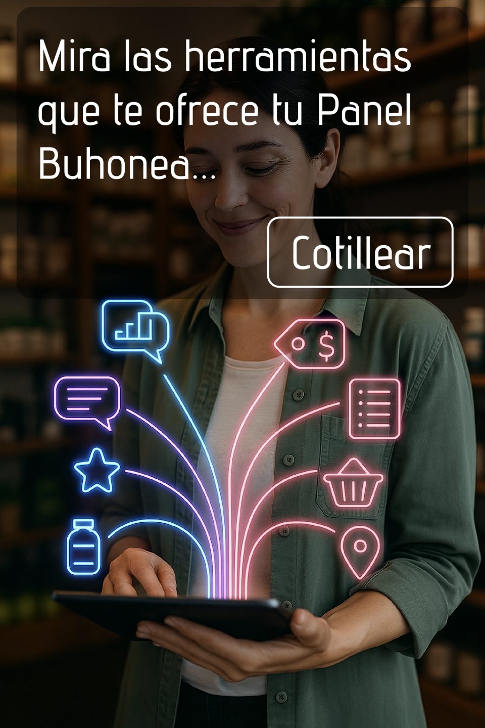 El Panel es el centro de mando de tu presencia en la app de Buhonea: aquí defines quién eres a tu estilo, qué ofreces, cuánto vale y cómo te encuentran. Hostelería y comercio tienen el mismo peso: gestionas artículos y productos (con herramientas únicas según tu negocio), publicaciones, horarios, ubicación, contacto y la imagen que quieres proyectar. Un solo perfil, coherente y actualizable en tiempo real. Sin historias, algoritmos o pagos por destacar.